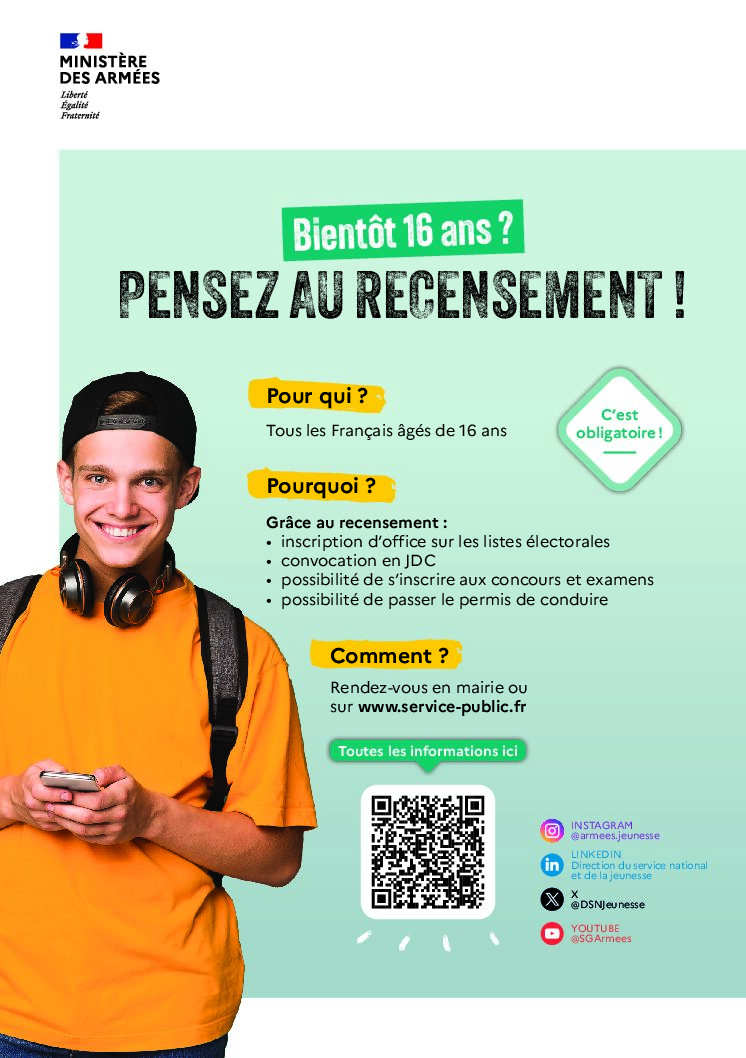 Le recensement est obligatoire pour tous les Français (garçons et filles) entre la date du 16ème anniversaire et la fin du troisième mois suivant, possibilité de régulariser la situation jusqu’à l’âge de 25 ans.